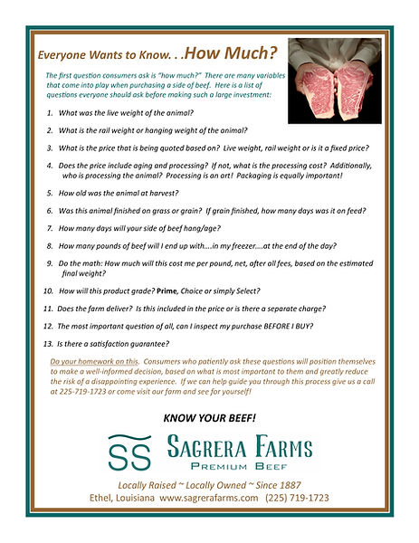 At Sagrera Farms, we offer premium quality beef in a range of cuts to suit every taste and occasion. Our beef is carefully raised and sustainably sourced to deliver exceptional flavor and tenderness. Prices vary depending on the hanging weight of each animal. Enjoy the best of farm-to-table freshness with Sagrera Farms beef, where we consistent, predictable, tender, flavorful angus beef, every time!